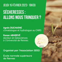 "En Bretagne, disons-le, il pleut. Les ressources en eau ne sont pas pour autant si faciles à mobiliser. À l’échelle du bassin rennais, une vingtaine de ressources et une dizaine d'usines de potabilisation assurent l’alimentation en eau potable des 500 000 habitants de la collectivité. Maintenant, projetons-nous dans 20, 50, ou même 100 ans. Sous l’impact du changement climatique, le système d’approvisionnement sera-t-il toujours adapté ? Risque-t-on un jour de manquer d’eau à Rennes ? Ambitieuse question. Les outils de recherche développés autour de la modélisation numérique hydro(géo)logique sont utilisés pour simuler le cycle de l’eau, à l’échelle du bassin-versant, et selon multiples scénarios."2nde partie (45 min) : Camille Vautier