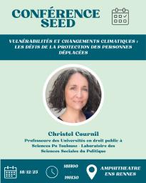 Christel Cournil professeure de droit public à Science Po Bordeaux, travaille depuis 2008 sur les questions de migrations environnementales, le droit des étrangers, le droit international des migrations, le droit de l'environnement et désormais sur les mobilisations du droit par la société civile. Elle a été membre du Projet de recherche EXCLIM, « Gérer les déplacements des populations liés aux phénomènes climatiques extrêmes » (2009-2012) et a co-dirigé un projet de recherche pour le Parlement européen Human Rights and Climate change: EU policy Options.