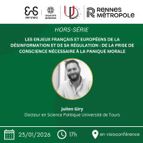 Ses activités de recherche portent essentiellement sur le conspirationnisme et les théories du complot. Julien Giry présentera une conférence sur le thème suivant : « Les enjeux français et européens de la désinformation et de sa régulation : de la prise de conscience nécessaire à la panique morale ».